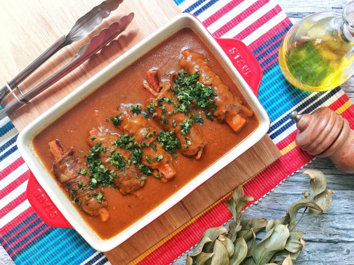 - Com cuidado, transfira os bifes à rolê e o molho para um refratário. Raspe o fundo da panela para aproveitar a crostinha que dá sabor ao molho;