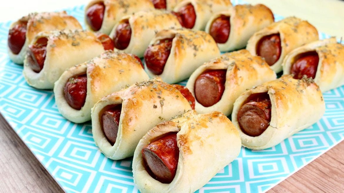 4- Abra a massa em superfície lisa e enfarinhada, corte um quadrado no tamanho do comprimento da salsicha, e enrole a salsicha na massa. Corte os enroladinhos no tamanho que desejar.
