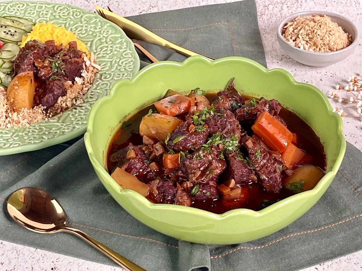 Carne de panela tem que ter caldo delicioso! O mirepoix de cenoura, cebola e salsão se desmancha na pressão, engrossando e temperando o caldo. O vinho tinto seco traz acidez, ajuda a concentrar os sabores e deixa a carne mais macia. O tomilho dá um toque de frescor ao preparo.