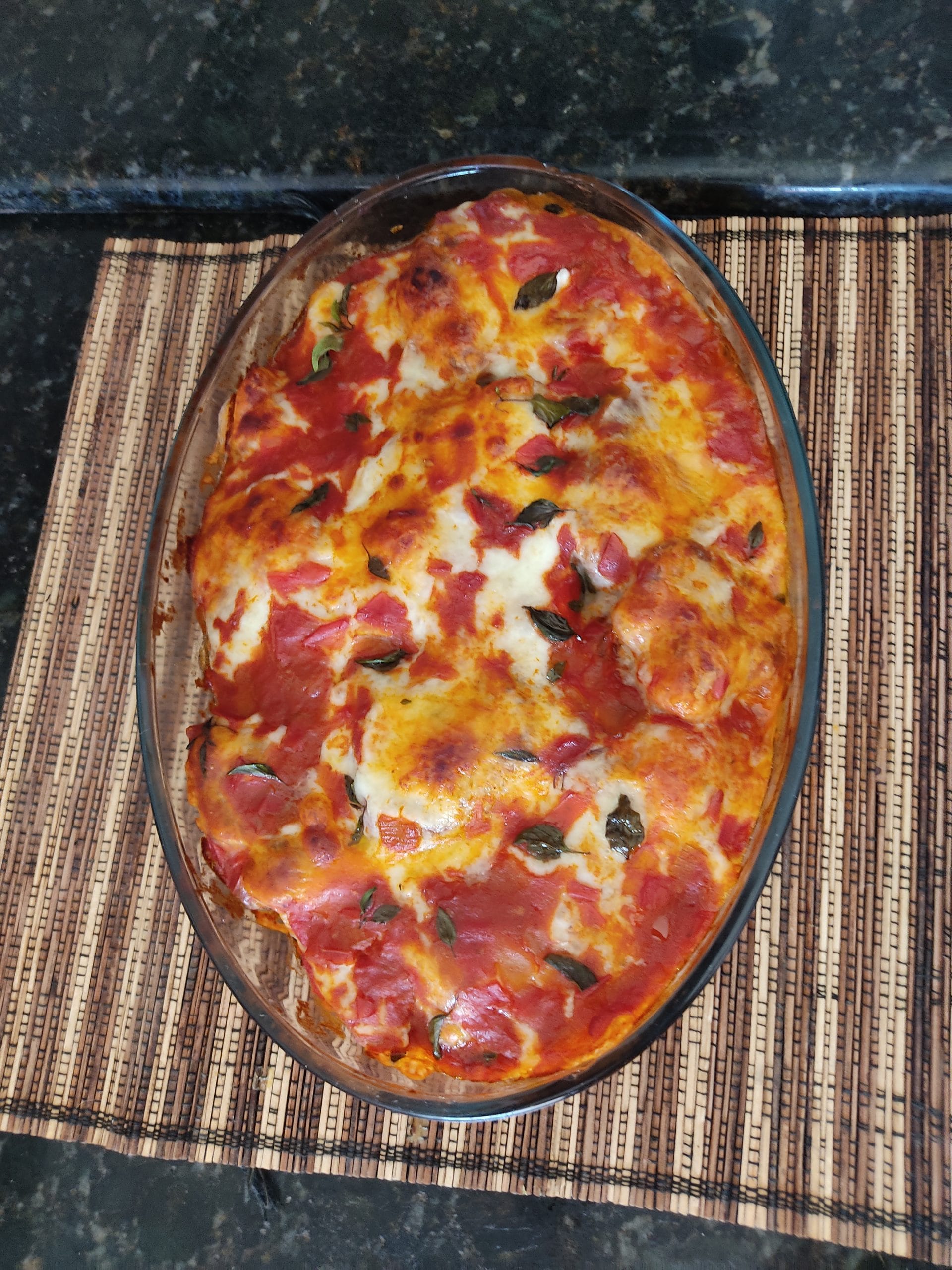 - Em uma travessa que pode ser levada ao forno, faça uma camada de massa de tomate.