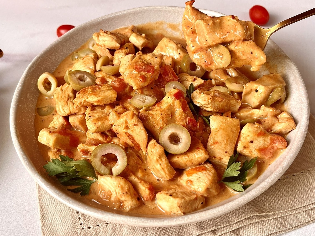 Esse frango fica bem cremoso e por isso é perfeito para ser servido com arroz, legumes ou salada. Se quiser, finalize com salsinha, cebolinha ou coentro. As ervas vão trazer um aroma delicioso e refrescante ao prato!