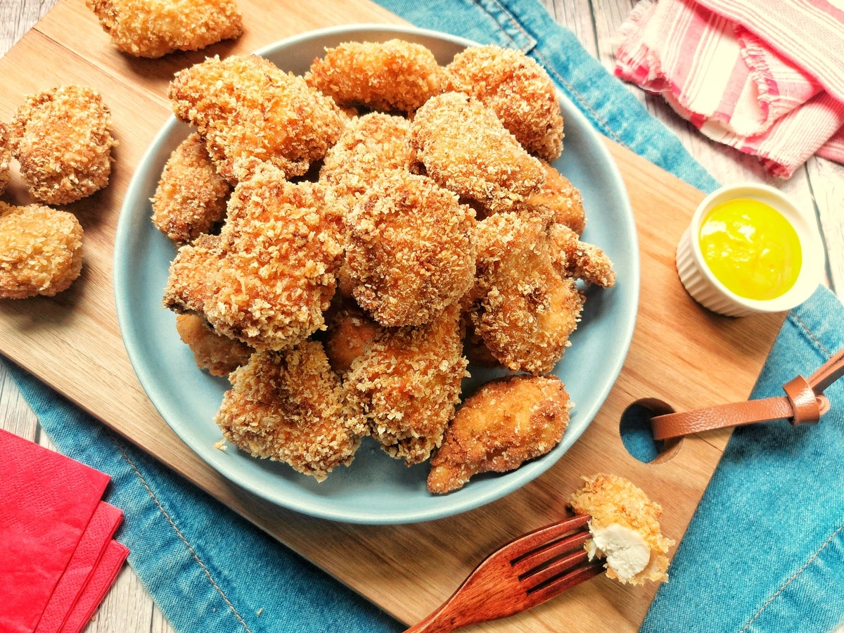 Quando você morde o frango, escuta o barulhinho crocante do empanado. Por dentro, fica suculento, bem temperadinho. Na hora de fritar, a casquinha não se desmancha e não encharca de óleo. O detalhe é empanar na farinha panko e, em seguida, já fritar para não absorver muita água.