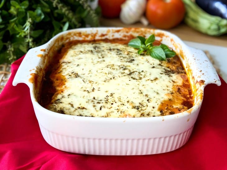 - Em uma assadeira, faça camadas intercaladas de molho de tomate, berinjela, abobrinha e fatias de queijo meia cura. Faça essas camadas até finalizar os ingredientes;