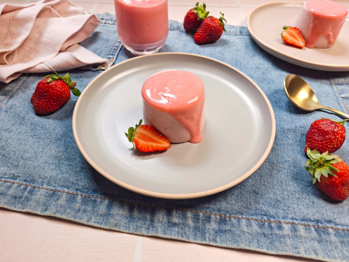- Após desenformar, finalize a panacota com essa cobertura e decore com mais morangos frescos a gosto.