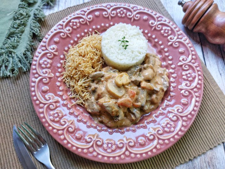 Molho cremoso, carne macia e cogumelos suculentos. Em menos de meia hora, você prepara um estrogonofe de carne muito saboroso. Atenção aos detalhes, como manter os cortes uniformes e dourar as tirinhas de carne ao invés de cozinhar. Rende bastante e, se sobrar, recheie sanduíches e pizzas.